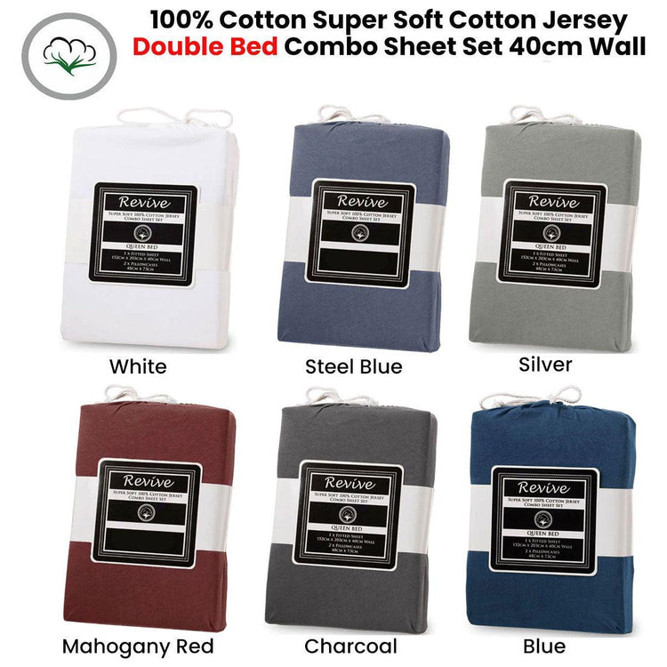 Revive Blue 100% Cotton Jersey Super Soft Fitted Sheet Combo Set Double 38cm Wall