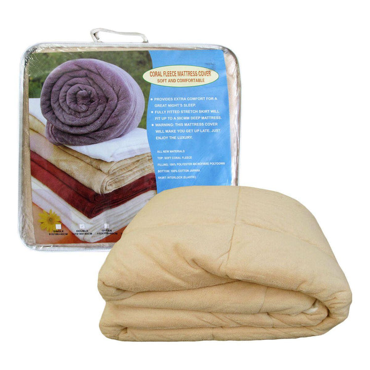 Extend the life of your mattress and the comfort you need with this great quality Sand Coral Fleece Soft and Warm Mattress Underlay (can be used as Topper or Mattress protector), perfect for winter months. It features a fully fitted stretch skirt and elastic that will fit up to 50cm deep mattress. It is made from soft and cosy coral fleece face with top quality Japara Cotton on reverse that provides extra comfort for a great night's sleep.