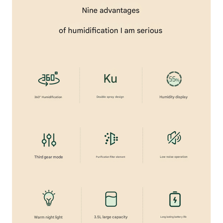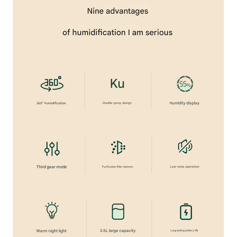 • Large 3.5L Capacity: The generous water tank provides long-lasting operation, reducing the need for frequent refills and ensuring continuous comfort throughout the day or night.