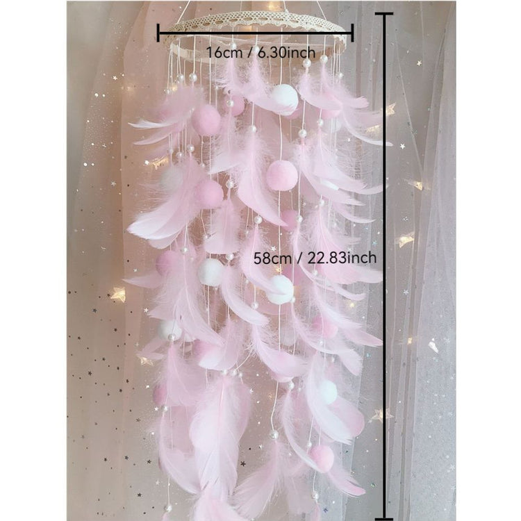 Transform any room into a soft, dreamy haven with this beautiful feather and pom-pom hanging mobile. Designed to capture the imagination, this piece combines the gentle sway of a wind chime with the whimsical aesthetic of a dreamcatcher, creating a stunning visual centerpiece that brings a sense of peace and wonder to your space.