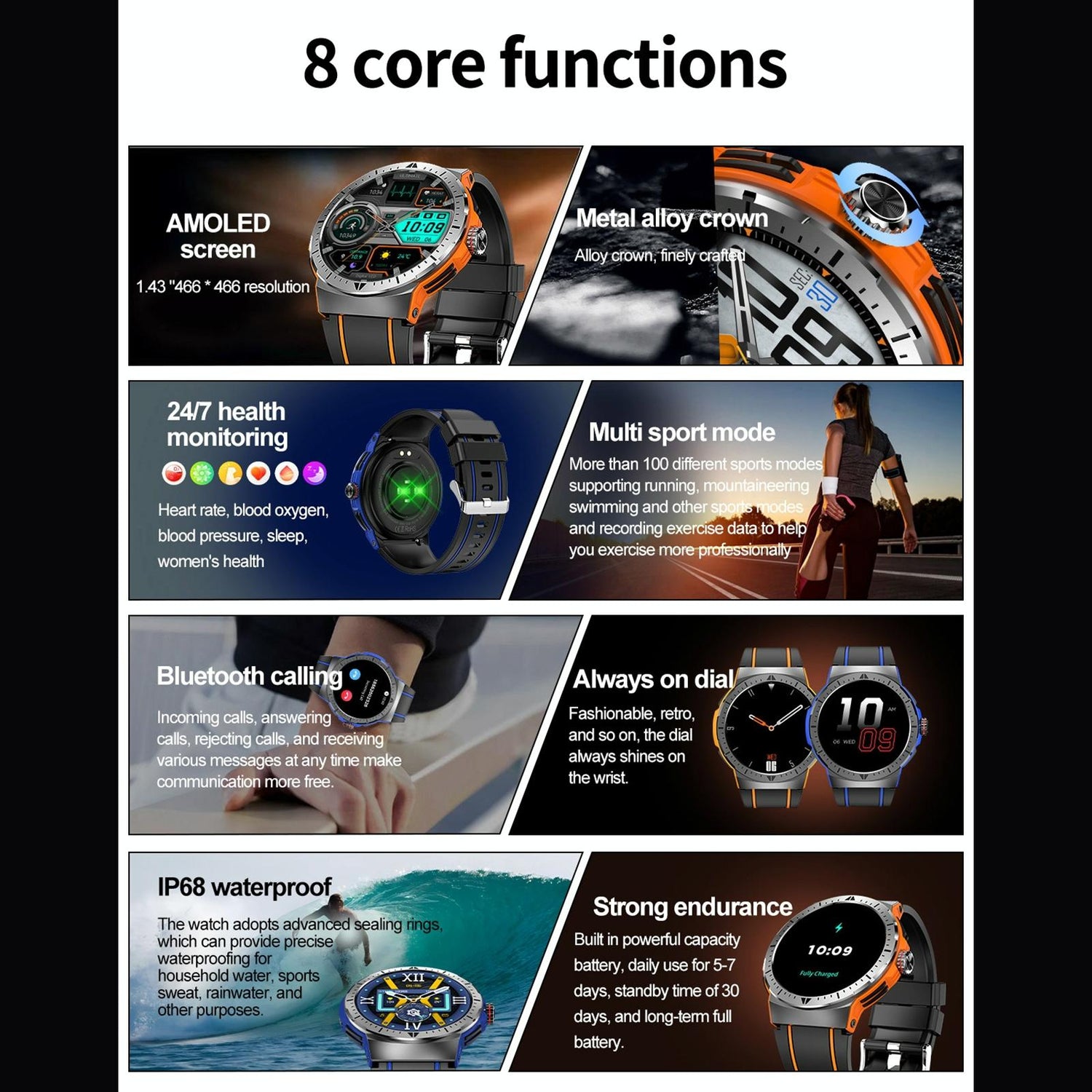 • 1 x 1.43 Inch Bt5.3 Ip68 Sport Smart Watch Support Bluetooth Call / Message Notification / Heart Rate / Blood Pressure Health Monitor