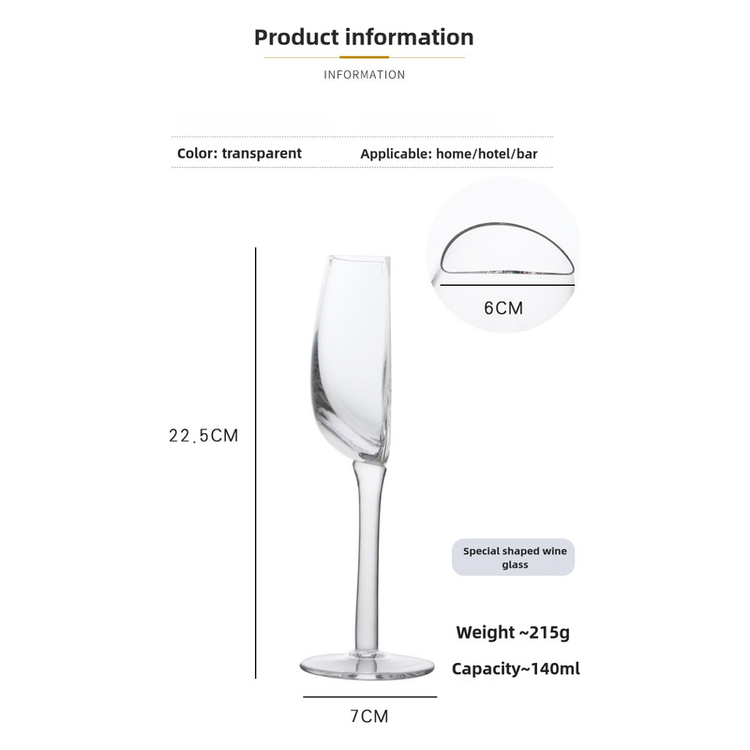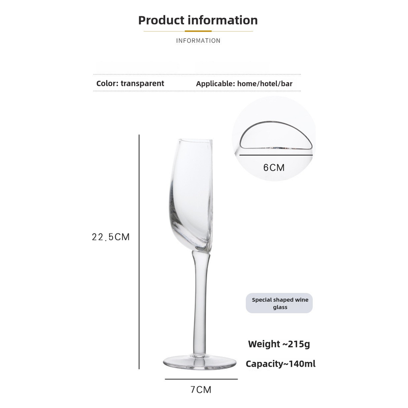 Enhance your wine experience with this elegantly designed half-round crystal wine glass. With its modern asymmetrical design, this flute adds a touch of sophistication to any occasion. Whether you're sipping champagne, white wine, or a creative cocktail, this glass is a stunning conversation piece.