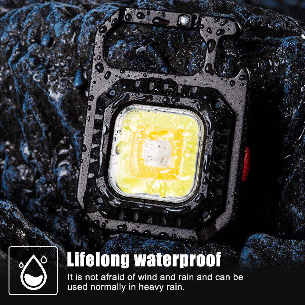 The flashlight is equipped with a magnetic base for hands-free use, allowing you to attach it to metal surfaces. Its waterproof design ensures reliability in harsh weather conditions, making it ideal for outdoor adventures. Lightweight and portable, this keychain light easily attaches to your keys, bag, or belt, ensuring you always have a reliable light source and safety tool at hand.