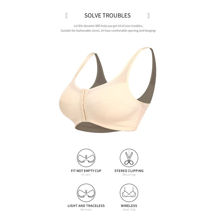 Experience ultimate comfort and style with the Women's Wireless Large-Cup Lace Bra, designed for women seeking support without sacrificing ease. Featuring a front clasp with button lace stitching, this bra is easy to put on and take off, making it perfect for everyday wear. The wireless, rimless cups provide a natural lift with 1/2 bevel shaping to prevent sagging, while the breathable multi-breasted lace panel keeps you cool and comfortable. The sexy back design includes non-slip, elastic straps that offer a secure fit without discomfort. Crafted from soft, silky polyester fiber, this beige bra combines functionality with elegance, ideal for all-day wear.