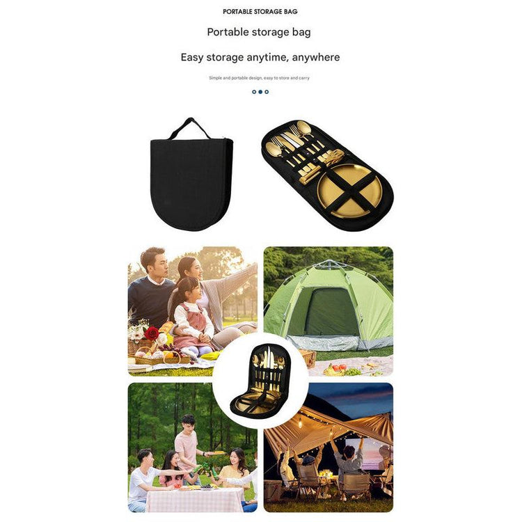 6-Piece Portable Stainless Steel Cutlery Set with Plate and Bag - Gold, Great for Camping and Travel (Steak Knife)