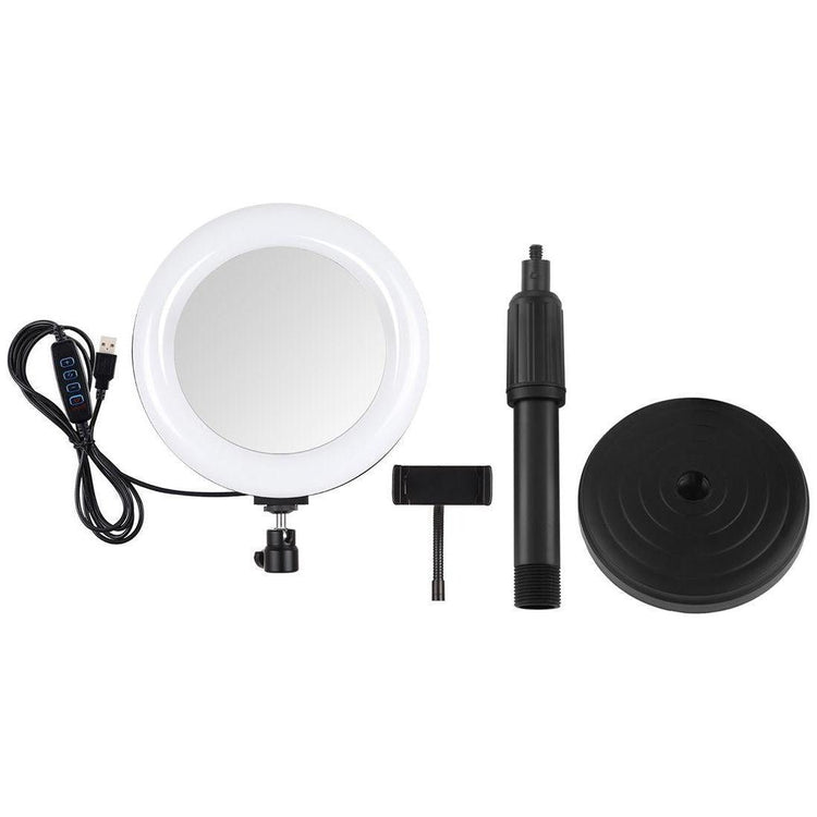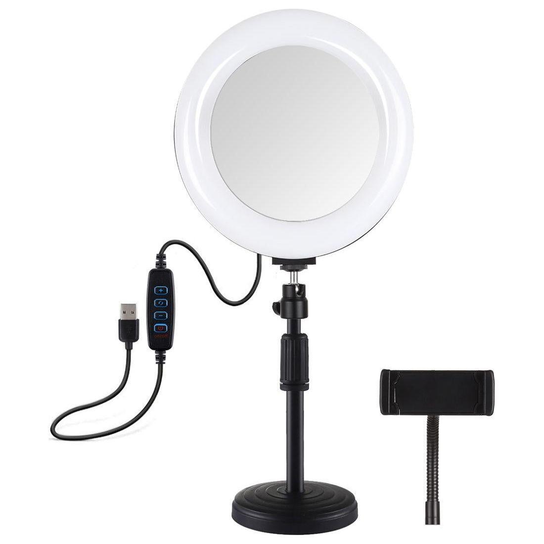 • 1 x 7.9 Inch 20Cm Mirror Light Round Base Desktop Mount 3 Modes Dimmable Dual Colour Temperature Led Curved Light Ring Vlogging Selfie Photography Video Lights With Phone Clamp Black