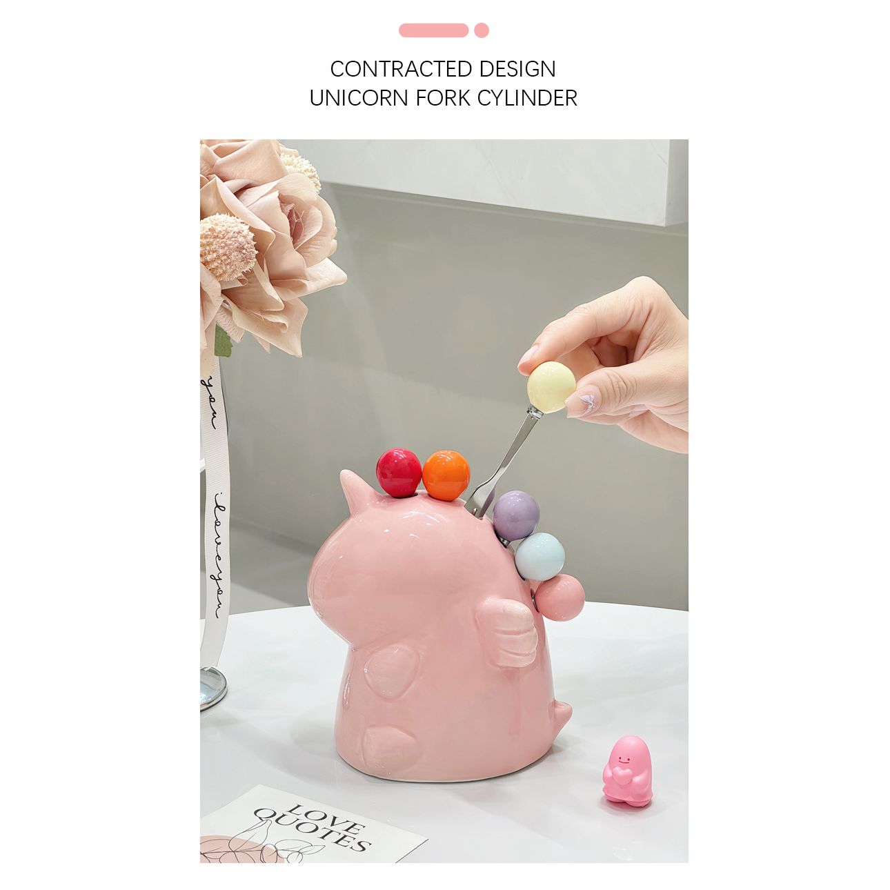 Add a sprinkle of magic to your dining table or dessert spread with our Adorable Unicorn Ceramic Fruit Fork Holder Set. This charming set features a cute unicorn-shaped ceramic barrel designed to hold stainless steel fruit forks. The forks themselves are topped with colorful, round ceramic balls, making them easy to grip and delightful to use. The unicorn holder offers convenient and tidy open-access storage for the forks, enhancing home aesthetics and bringing a sense of everyday ritual to your fruit enjoyment. Perfect for parties, daily use, or as a unique decorative piece, this exquisite all-in-one set is both practical and enchanting. The stainless steel forks are designed to be smooth and gentle on the tongue.