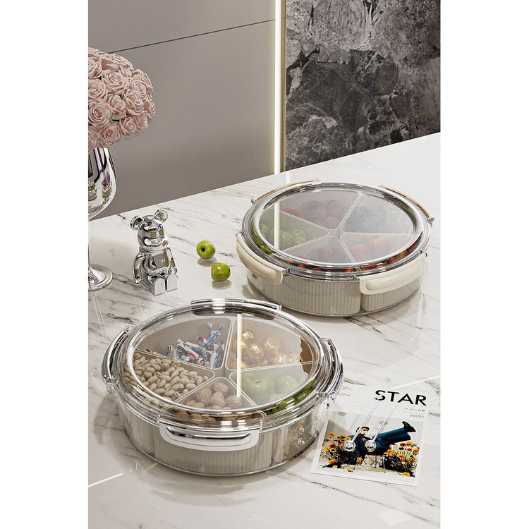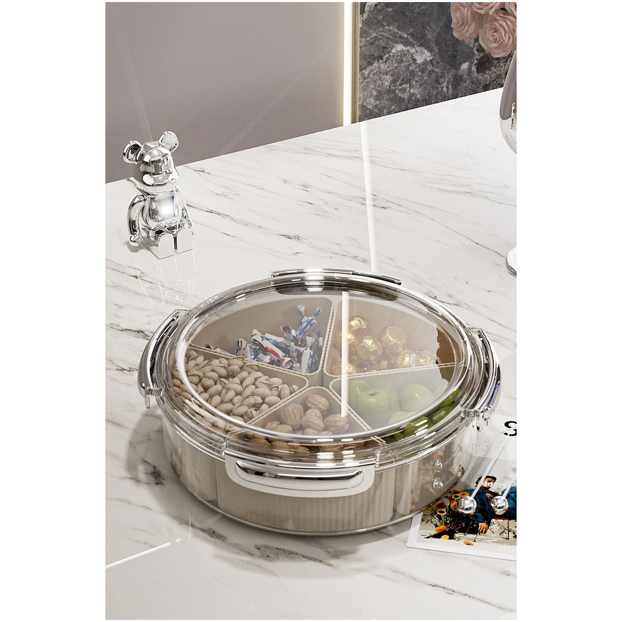 Present your snacks, fruits, candies, and nuts beautifully with this versatile and elegant compartment serving tray. Featuring a clear lid and secure buckles, it's perfect for keeping treats organized and fresh, whether for everyday use in the living room or for entertaining guests.