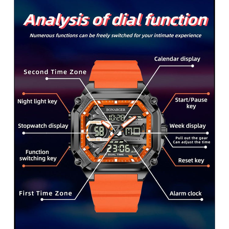 Whether you're navigating a busy schedule, hitting the gym, or exploring the outdoors, the Multi-functional Watch delivers the perfect blend of standout style, essential features, and reliable durability. Its large dial and sporty design make it an unmissable accessory.