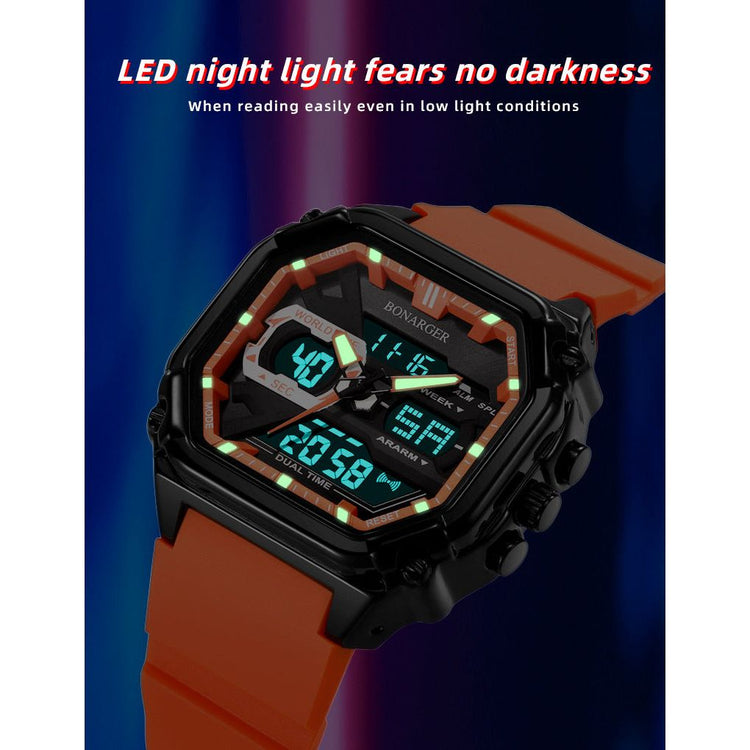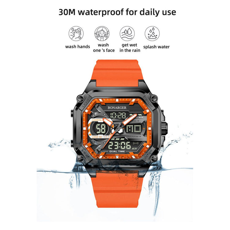 Make a bold statement with the Men's Watch, a perfect fusion of rugged style and advanced functionality. Designed for the modern, active man and trend-setting student, this watch features a striking large square dial (43mm x 47mm) and a comfortable, vibrant silicone strap, ready for urban exploration or outdoor adventures.