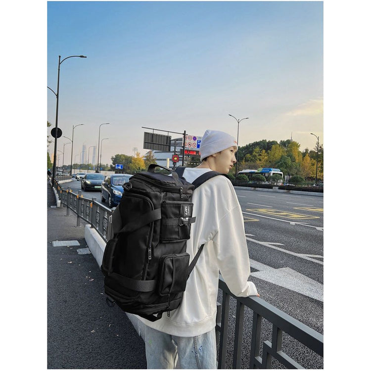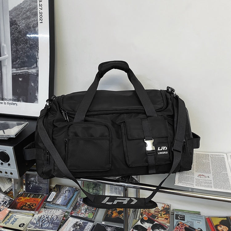 Black Unisex Travel Bag with Utility Buckles and Wet/Dry Compartments