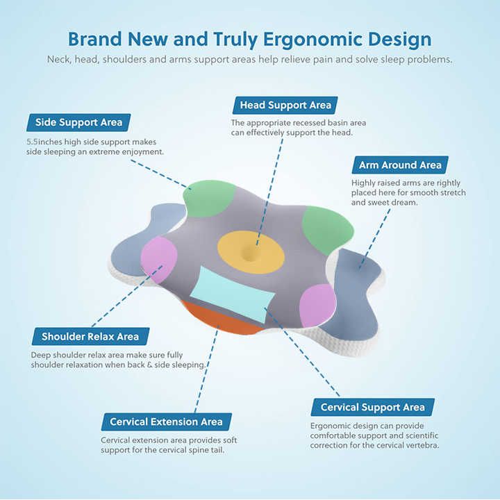• Unique Ergonomic Butterfly Design: The distinctive butterfly shape features a central cervical contour to support the natural curve of your neck, while the 'wings' provide comfortable armrests and support for side sleepers. This design helps reduce tossing and turning.
