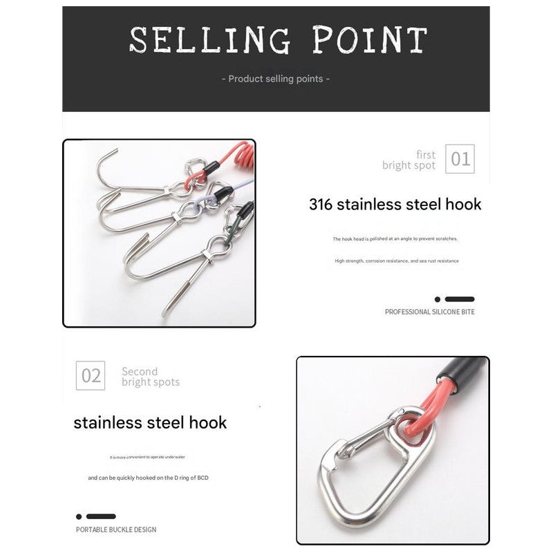 • Secure Anchoring in Currents: Designed to securely hook onto rocks or dead coral, allowing divers to remain stationary in strong currents, reducing fatigue and improving safety. The hook ends are polished to minimize scratching.