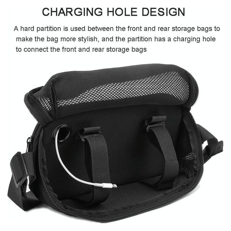 • Stylish hard partition with charging hole to connect front and rear storage bags