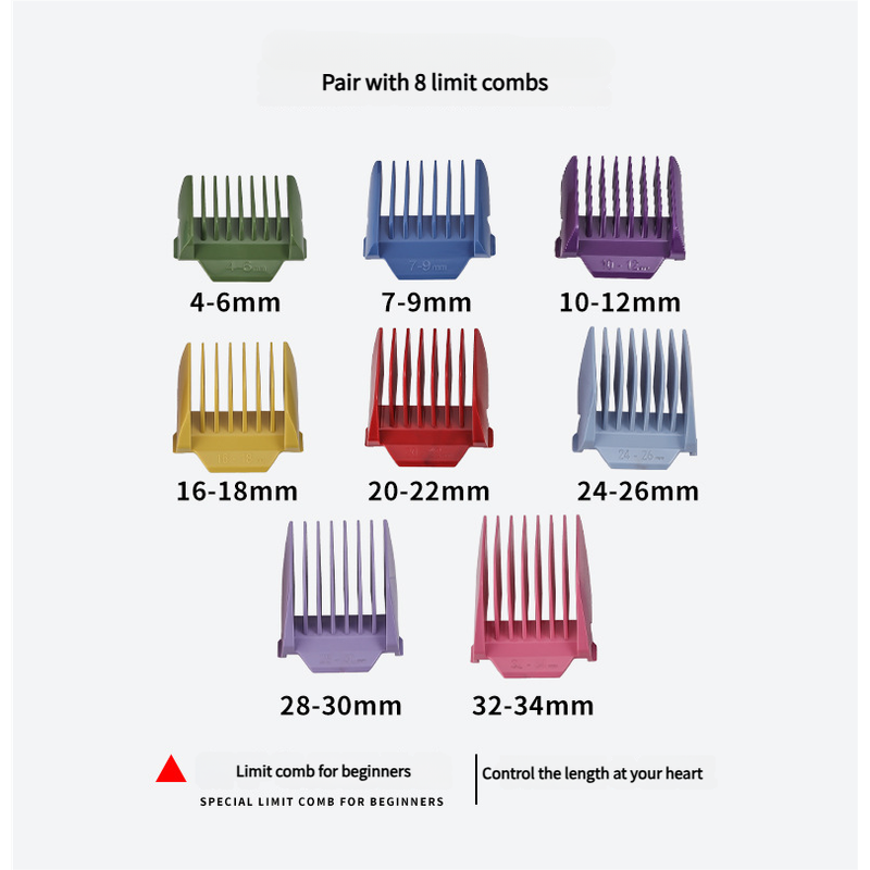 • 8 adjustable length combs: 4-6mm, 7-9mm, 10-12mm, 16-18mm, 20-22mm, 24-26mm, 28-30mm, 32-34mm