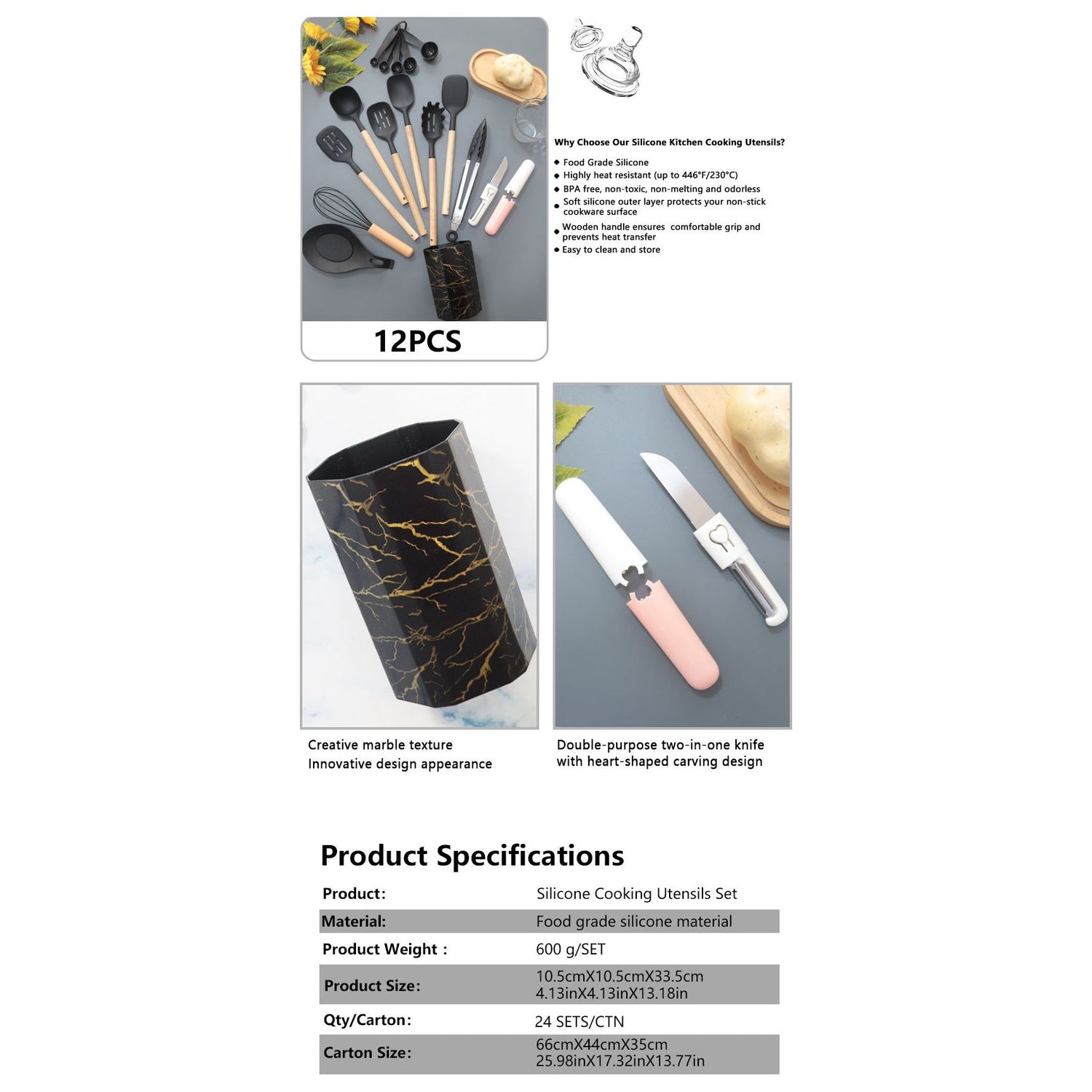 Each utensil features a wooden handle for a comfortable grip and is heat-resistant up to 230 degrees Celsius, making them ideal for a wide range of cooking tasks. The dual-purpose knife combines cutting and peeling functions with a heart-shaped carving design, adding a creative touch to your food prep. Perfect for everyday cooking, this set is easy to clean and built to last, making it a must-have for any kitchen.