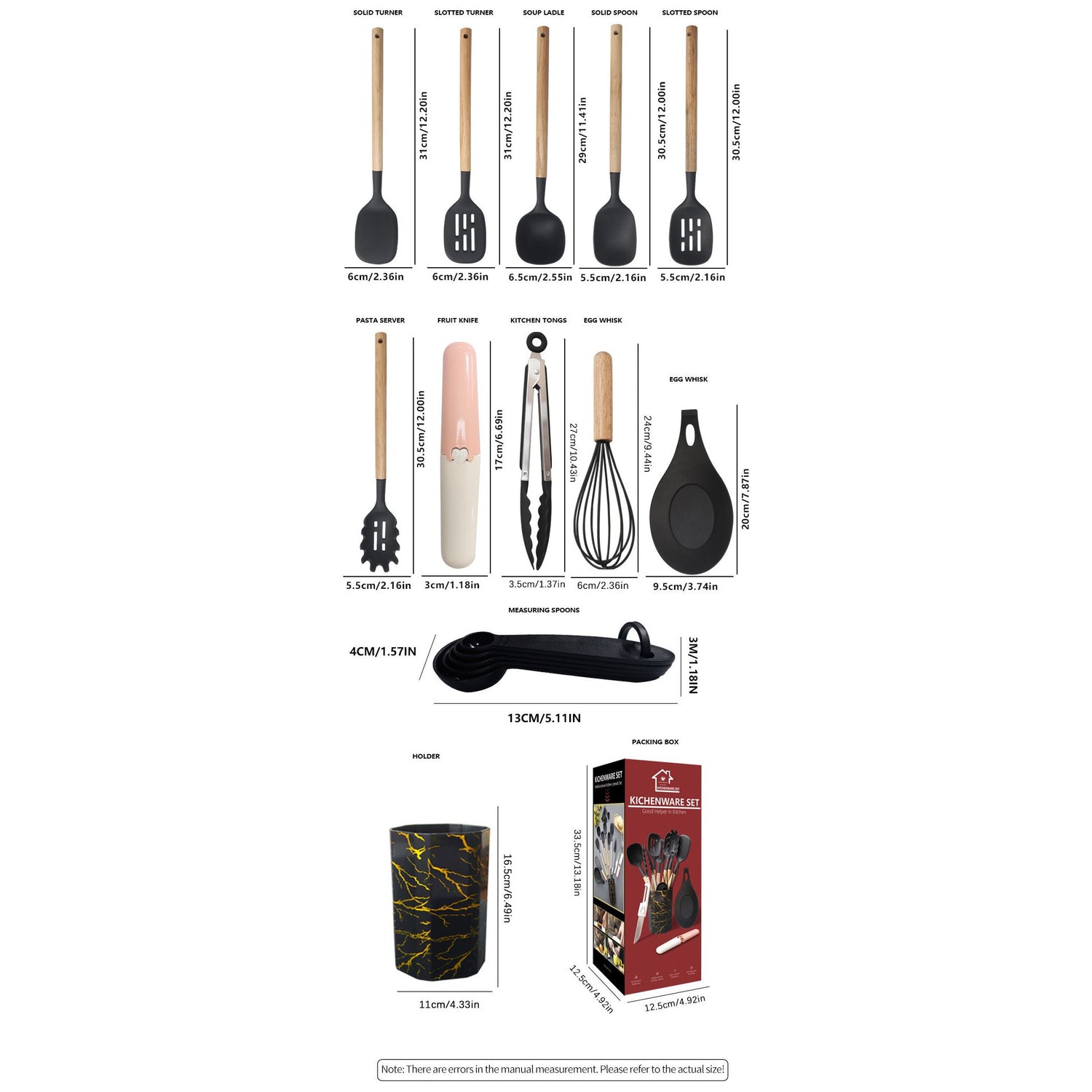 This product does not contain lithium batteries. Due to manual measurements, please allow a 1-2cm difference in size. Ensure utensils are cleaned and dried thoroughly to maintain their condition. Avoid prolonged exposure to high heat to preserve the integrity of the silicone.