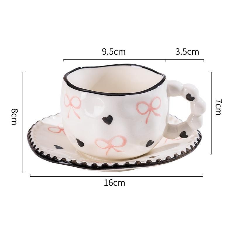 Hand-Painted Ceramic Coffee Mug and Saucer Set - Whimsical Afternoon Tea Cup with Spoon(Black-edged bow)