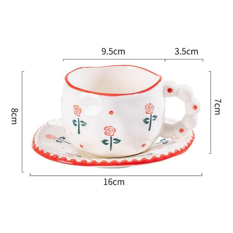 Hand-Painted Ceramic Coffee Mug and Saucer Set - Whimsical Afternoon Tea Cup with Spoon(Red rose)