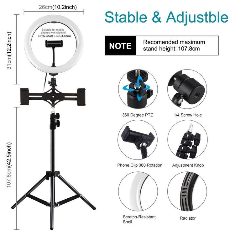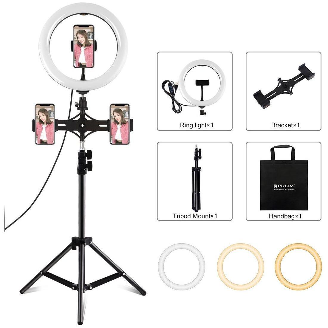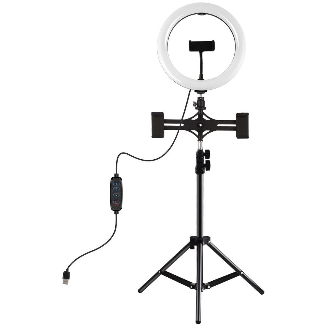 • 1 x Dual Phone Brackets Horizontal Holder 1.1M Tripod Mount 10.2 Inch 26Cm Led Ring Vlogging Video Light Live Broadcast Kits Black