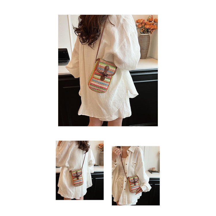 Khaki Boho Chic Woven Straw Crossbody Bag - Colourful Striped Mini Phone Pouch with Toggle Closure