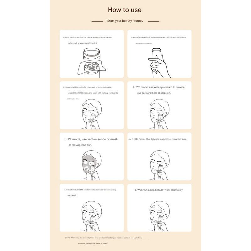 5. RF (Red Light) mode: Use with essence or face mask for skin massage.