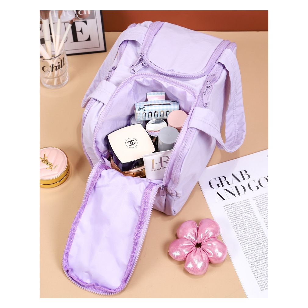 - Multiple Pockets: Includes mesh pockets and additional sleeves within the side compartments for organizing smaller items like lipsticks, eyeshadows, or travel-sized toiletries.