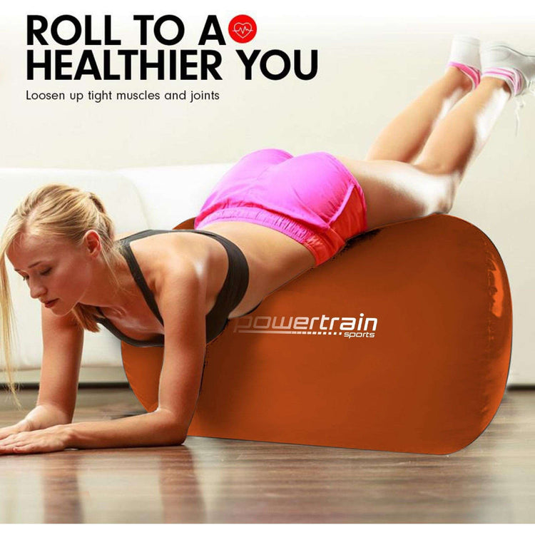 Improve your strength, balance, and coordination with Powertrain's inflatable air barrel. This orange air barrel is designed to help gymnasts learn front flips and backflips safely, with a wide surface to provide gentle cushioning and support.