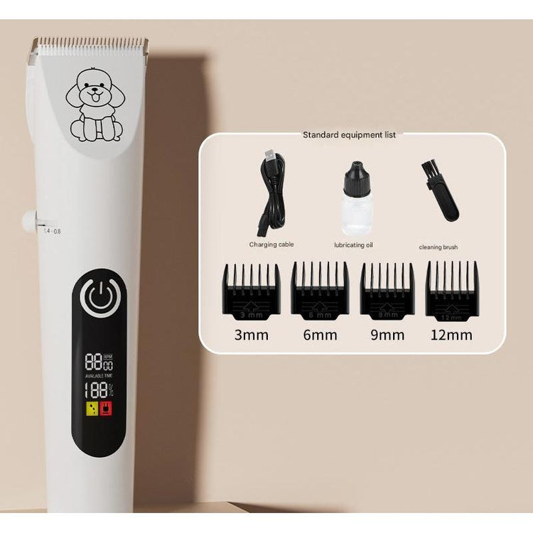 Keep your beloved pet looking their best with our Professional Pet Grooming Hair Clipper Kit. This comprehensive set is designed for easy and efficient grooming at home, featuring a high-quality titanium alloy ceramic blade that ensures a smooth, non-stuck haircut without causing skin damage, thanks to its shaped acute angle design. The clipper offers five-speed fine adjustment of the cutter head (0.8mm-2.0mm) via a convenient rotating mechanism, making it easy for novices to achieve precise results. It comes with four length limit combs (3mm, 6mm, 9mm, 12mm) for custom trimming lengths. The detachable cutter head supports washing for convenient cleaning. This rechargeable clipper is equipped with a durable motor, a long-lasting battery, and clear charging indicator lights.