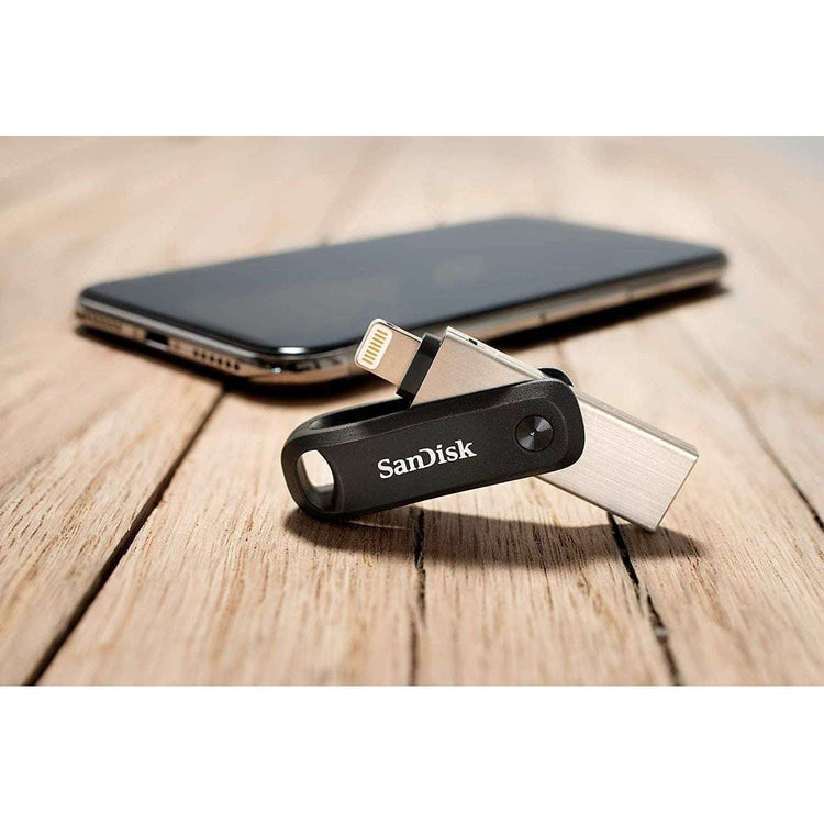Need more space on your iPhone? The expands flash drive go is the easy way to free up Memory. Keep your memories safe by simply plugging in the drive to automatically back up your photos, videos and contacts. Once files are on the expands drive, you can use the high-speed USB 3.0 connector to quickly move them onto your computer. You can also password-protect your files, across multiple devices, to keep them private. And the dual-purpose swivel protects connectors and features a keyring hole to take your drive on the go.