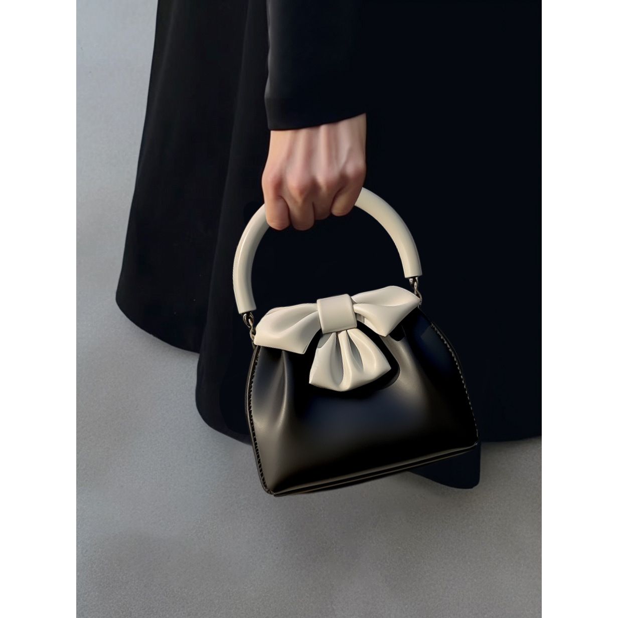 - Striking Contrast Design: A timeless black body beautifully accented with an oversized, sculptural white bow and a matching semi-circular top handle, creating a captivating visual appeal.