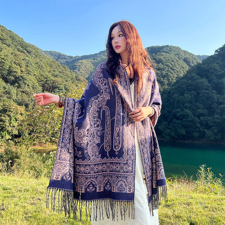 Wrap yourself in warmth and intricate style with our stunning Ethnic Inspired Faux Cashmere Shawl. This versatile piece features beautiful jacquard patterns and soft tassels, perfect for adding a touch of bohemian elegance and cozy warmth to your autumn and winter wardrobe.