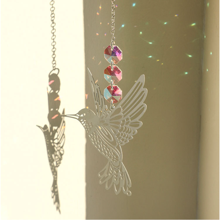 This suncatcher is designed to catch and refract sunlight, casting colorful patterns across your room for a magical effect. The lightweight metal construction allows it to sway gently, creating dynamic shadows that mimic the hummingbird's movement. Whether placed near a window to harness natural light or used as a wall decoration, it brings a serene and artistic vibe to any setting. The crystals are carefully selected to maximize light dispersion, making it a standout piece for both day and night.