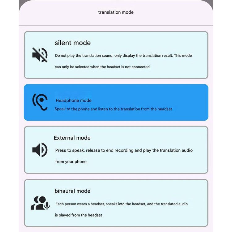 • Mute Mode: Displays translation results on your phone; can be used without earbuds connected.