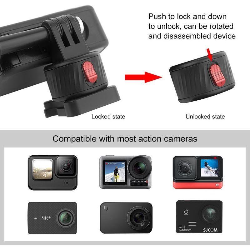 • Locking Function: Rotate the knob in the middle to quickly lock the camera, making it safer. After locking, the mount can be used for various vigorous activity, such as running, jumping, cycling, skiing, etc.