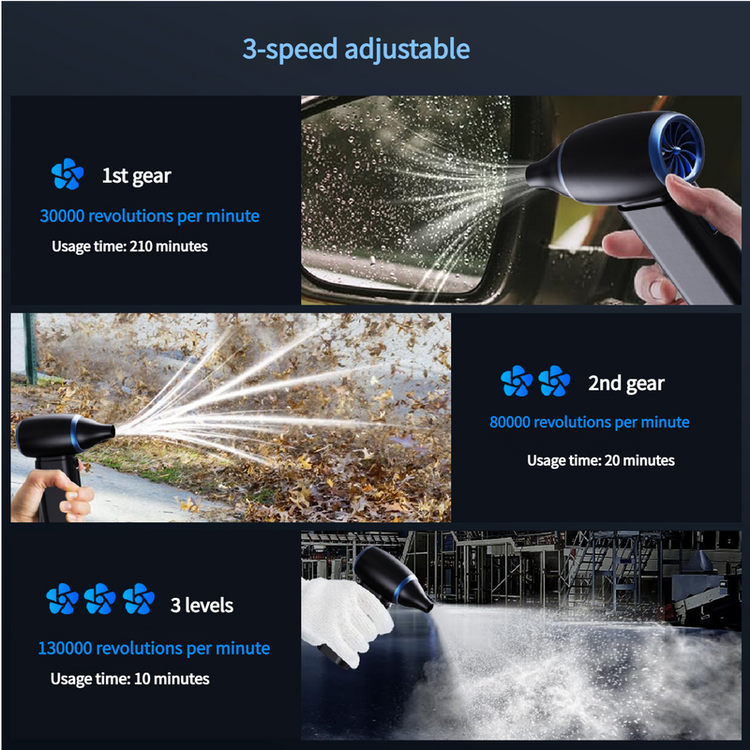 Experience powerful airflow on the go with this Portable Turbo Handheld Blower Fan. Equipped with a high-speed brushless motor reaching up to 130000RPM, this mini fan delivers strong wind for a variety of uses, from drying wet surfaces to clearing dust and debris. Featuring a 5000mAh rechargeable battery, it offers up to 210 minutes of usage on a single charge. With three adjustable speed settings and built-in LED lighting, this compact blower is perfect for outdoor activities, cleaning, or travel. Lightweight at just 0.353 lbs, it easily fits in your pocket or bag.