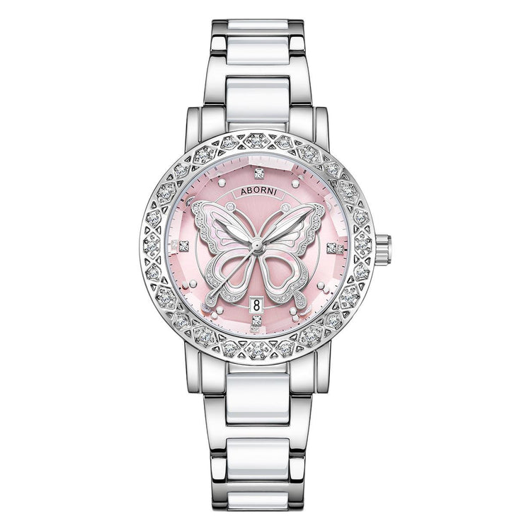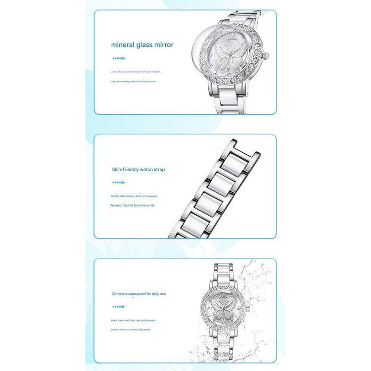 Introducing the Women's Butterfly Quartz Watch, a stunning timepiece that combines elegance and functionality. This fashionable watch features a butterfly mother-of-pearl dial adorned with intricate details, complemented by a ceramic and steel strap for a luxurious feel. With luminous hands for night visibility and a 30m water resistance rating, this watch is perfect for both daily wear and special occasions.