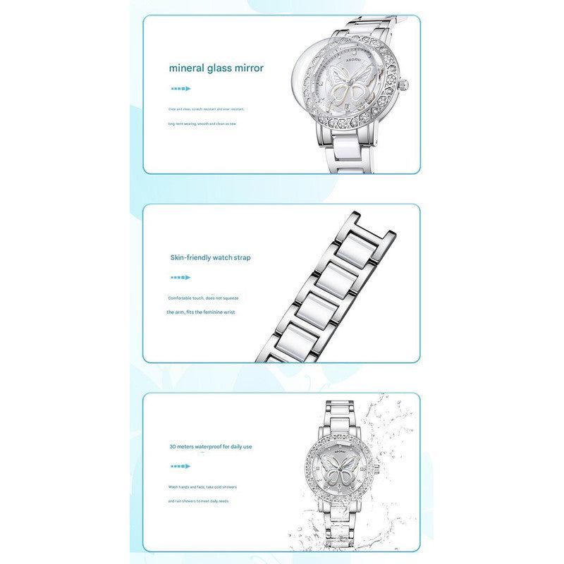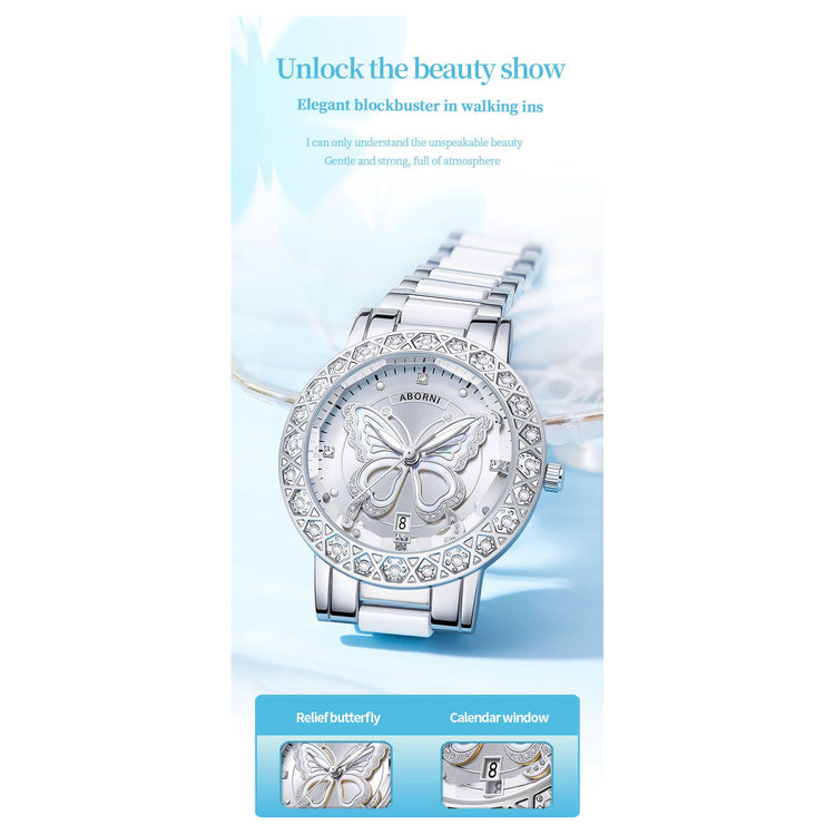 Designed for the modern woman, this fashionable quartz watch is a perfect accessory for any outfit. The butterfly mother-of-pearl dial adds a unique, elegant touch, while the ceramic steel strap ensures durability and comfort. Whether you're dressing up for an event or adding a chic touch to your everyday look, this watch delivers timeless style and practicality.