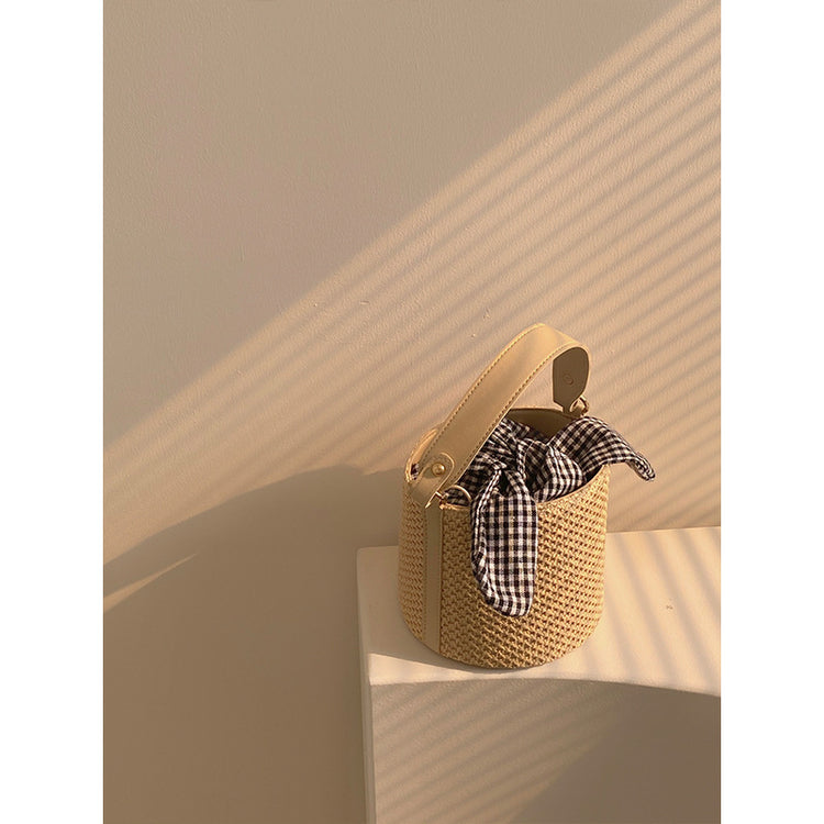 Charming Woven Straw Bucket Bag with Gingham Bow Accent