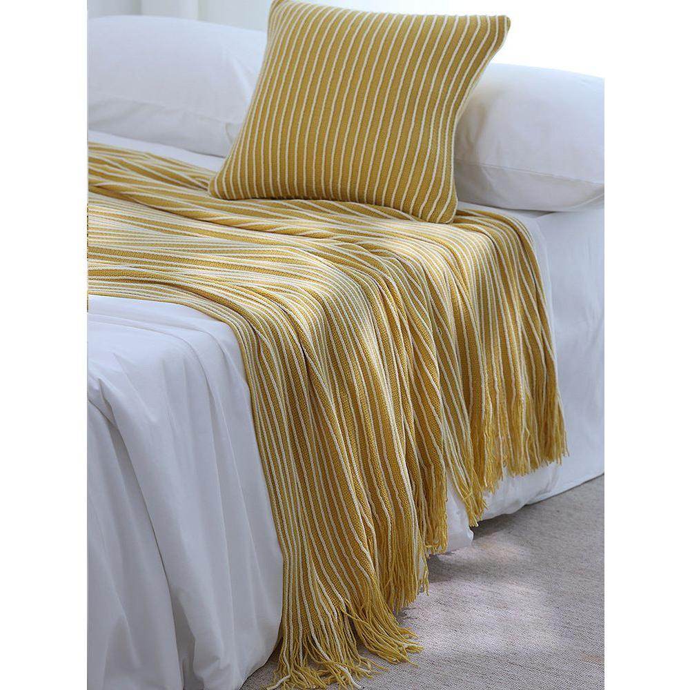Yellow Cozy Knit Throw Blanket with Fringe - Stylish Striped Bed End Cover, 127x170CM