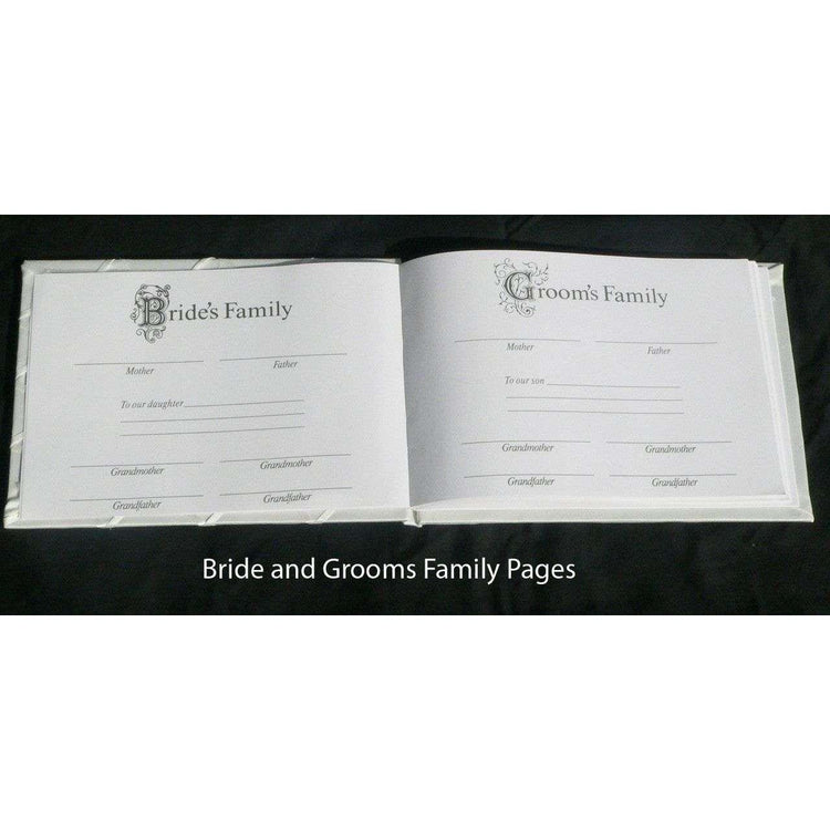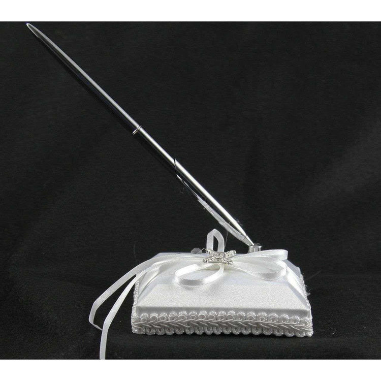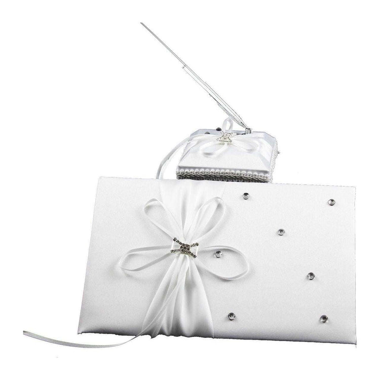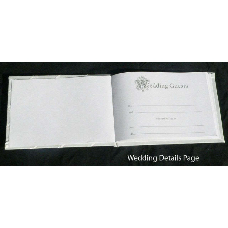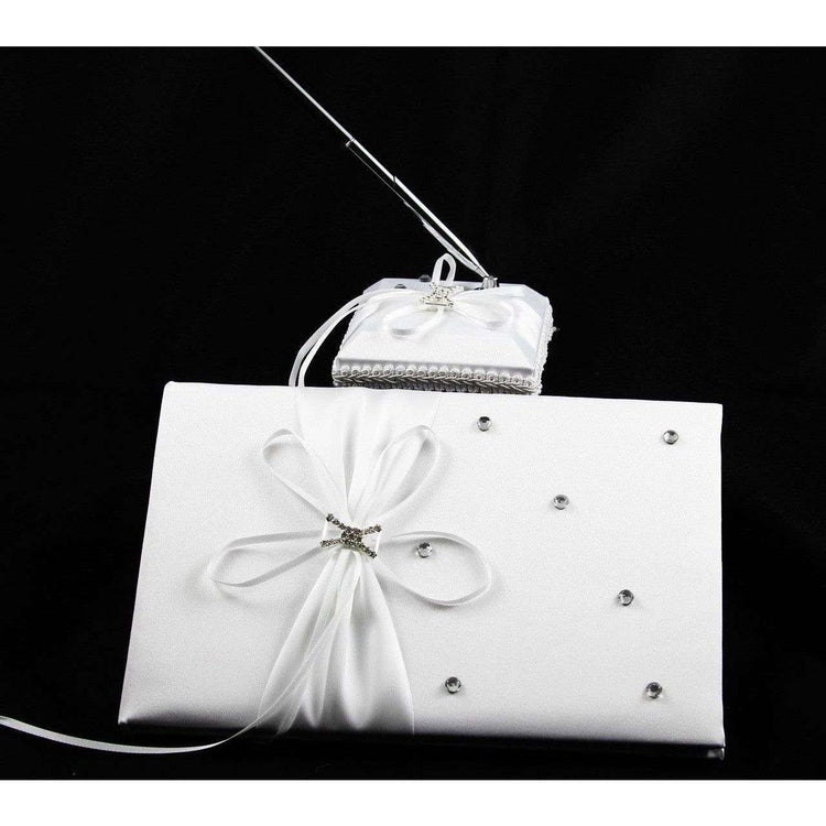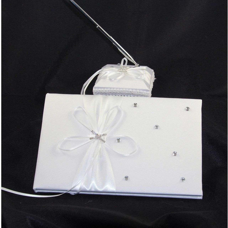 White Wedding Guest Book Register with Silver Pen Matching Stand Set 36 Lined Pages - White Ribbon and Diamante Bow Cover