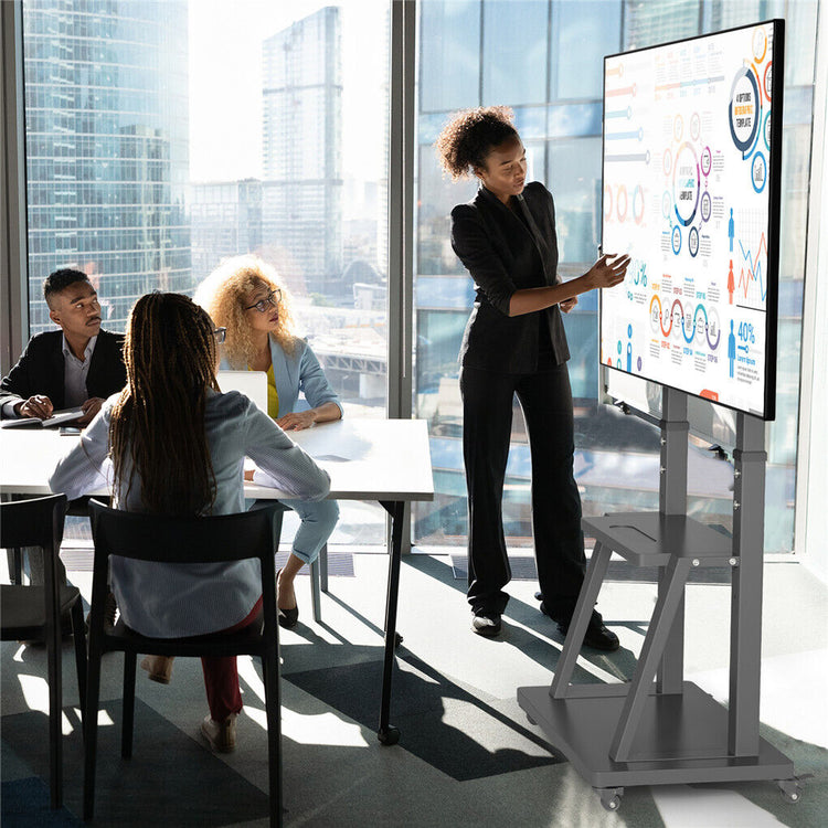 • Adjustable & Convenient: Easily adjust the height of the TV cart between 130cm and 160cm to suit various viewing preferences. The dual shelf design provides ample space for storing computers, DVD players, and other AV equipment, keeping everything you need at your fingertips.