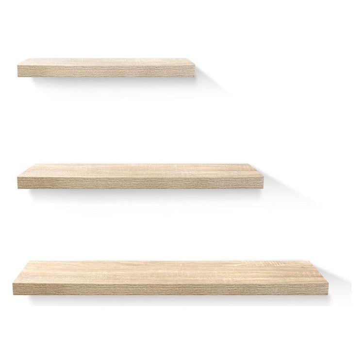 Need to add more shelf space? Display space? Lots of wall space? Perfect. Our Artiss Floating Wall Shelf is just the thing you need to create more space without occupying more floor space. And it comes in a set of three with 40cm, 60cm and 80cm lengths, allowing for flexible arrangements. Made of 32mm thick honeycomb board with melamine finish, the wall shelf can be easily installed within minutes with the included fittings. The extra thick shelf is strong enough to hold a variety of ornaments, collectibles, books, CDs, DVDs and more of up to 10kg. It is also 20cm wide, so that you need not worry about your items falling off due to lack of width. Mount the wall shelf in any room, to create focal points or poignant displays that speak volumes about your home and personality. Great for offices and retail establishments too.