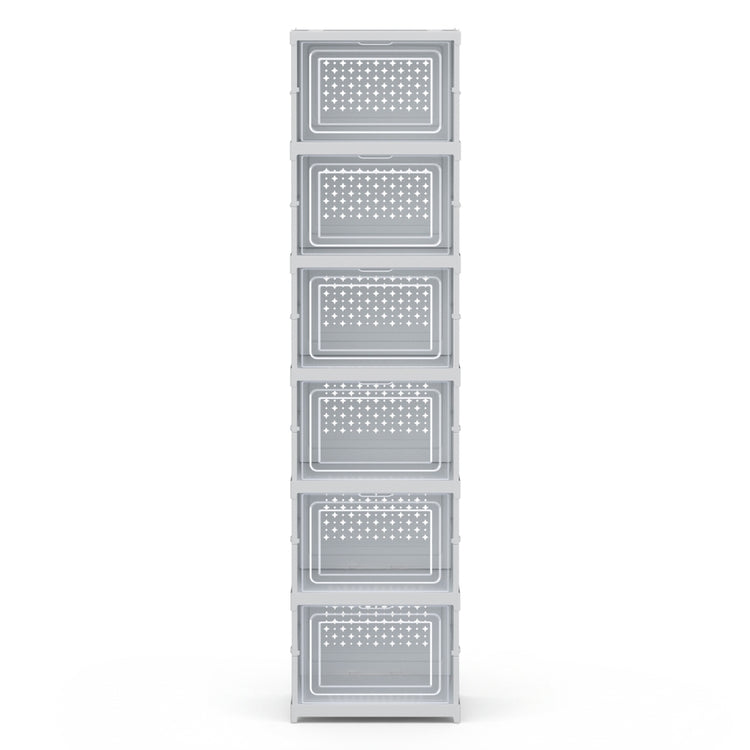 Maximise your space with this versatile Artiss shoe rack! Crafted from durable PP plastic, this 6-tier organiser offers clever shoe storage for entryways, cloakrooms, or garages. The innovative foldable design features a one-piece frame for quick setup, breathable back flaps, and see-through doors with raised handles for easy access. Each compartment holds up to 2.5KG, providing practical shoe box storage without sacrificing style. Perfect for small homes! Dimensions: 25.5x34.5x105cm. White. Assembly required (1 package).