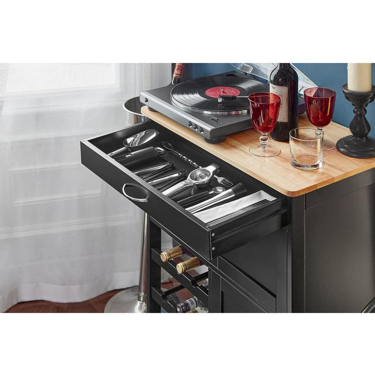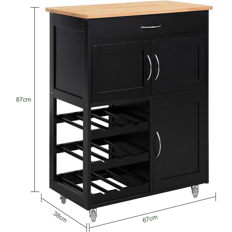 - This stylish and functional 3-tier wine bottle rack is the perfect addition to any home. It features one drawer and two cupboards, and is mounted on four swivel castor wheels (two of which are braked) for easy mobility. Enjoy the convenience of having your favorite wines and glasses stored in one place, and the added bonus of being able to move it around your home as needed.
