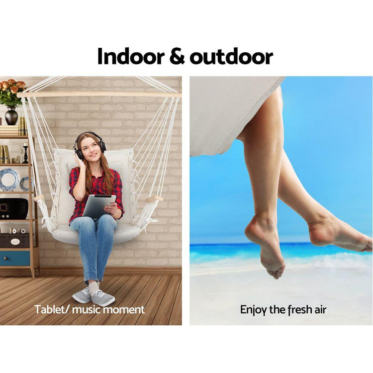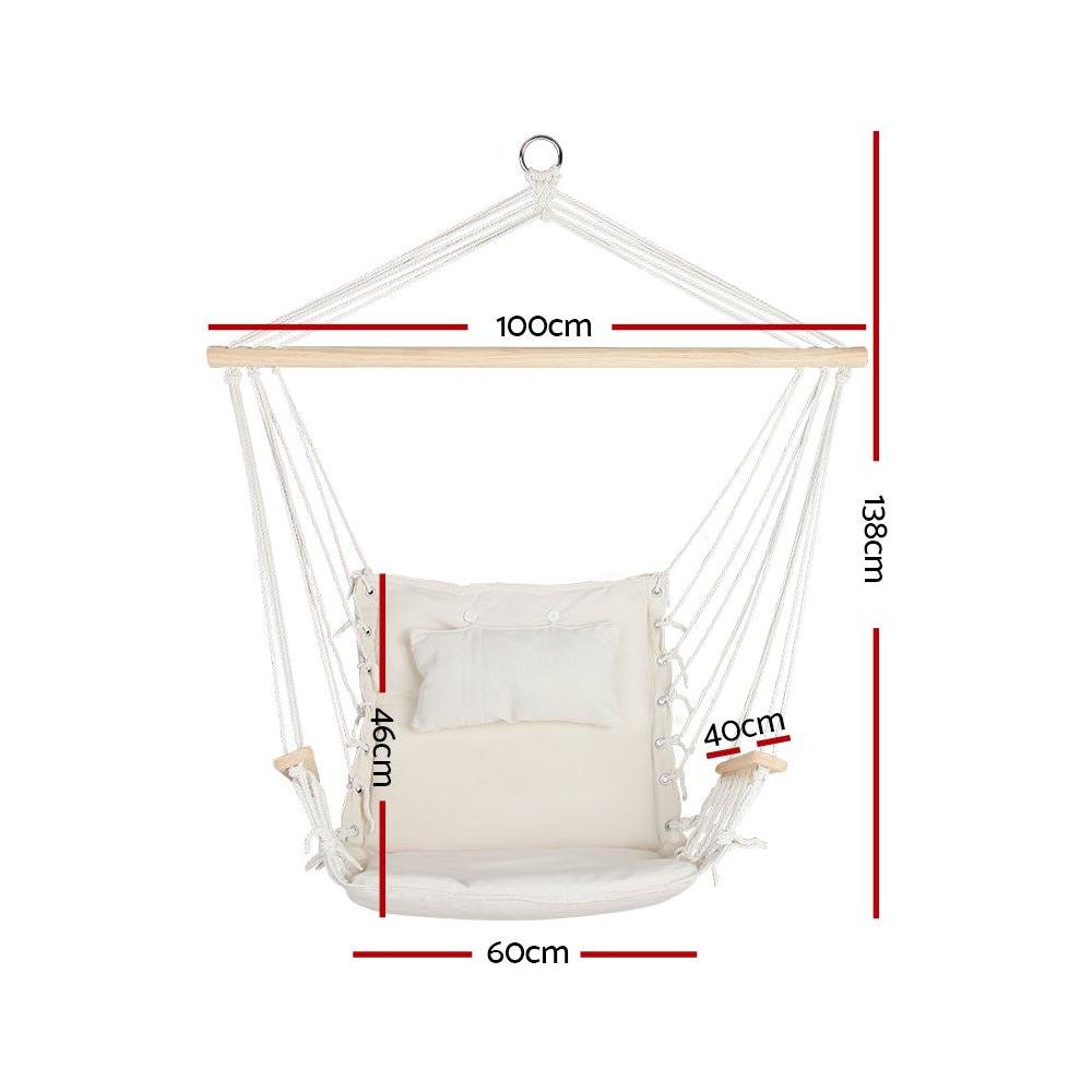 We want it to be a long lasting hammock at your home. Made of solid timber rail with quality polyester cotton, you can hang it at your backyard as a chilling spot for reading books or taking a nap. Its durable strings can hold up to 120kg that would suit almost everyone - anyone can chill any time. Comes with a soft pillow and padded seat, it is a nice comfy spot to chill at with a book or just listening to songs. Designed with armrests that lets you rest on whenever you like. Very simple installation, you can take it with you to a barbecue or on a vacation. It can be attached to trees, ceilings or pergola beams.