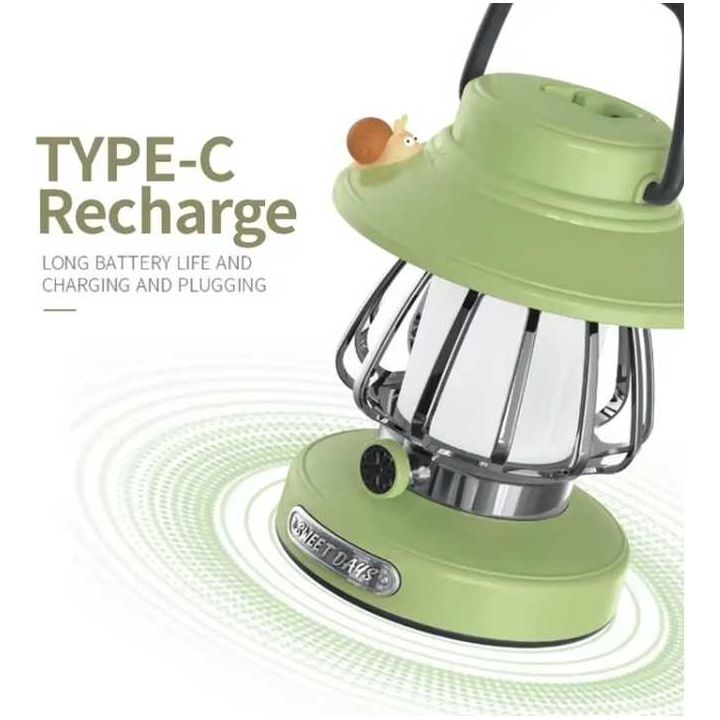 Green Retro Snail Night Light - Portable Rechargeable Camping Lantern with Hook, 3-Color Dimming