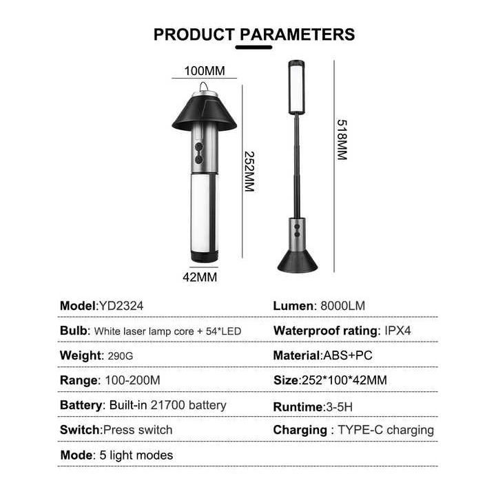 Illuminate your outdoor adventures with this multifunctional telescopic camping lantern. Designed for versatility and portability, it is perfect for camping, hiking, and emergency lighting needs.