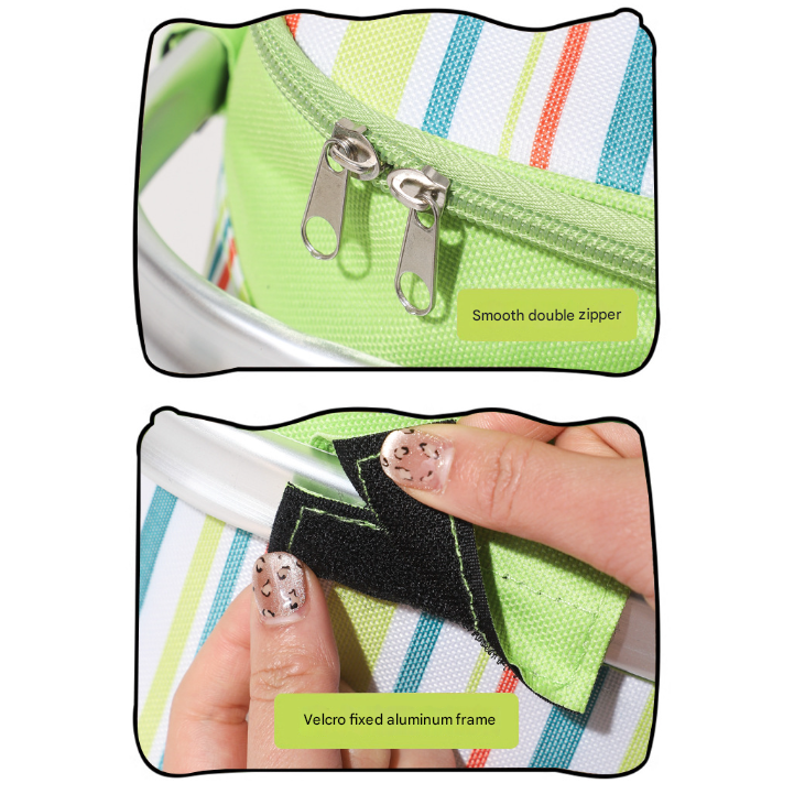 • Materials: Oxford Cloth (Outer), Pearl Cotton (Insulation), Aluminum Foil (Lining), Aluminum Alloy (Frame & Handles)