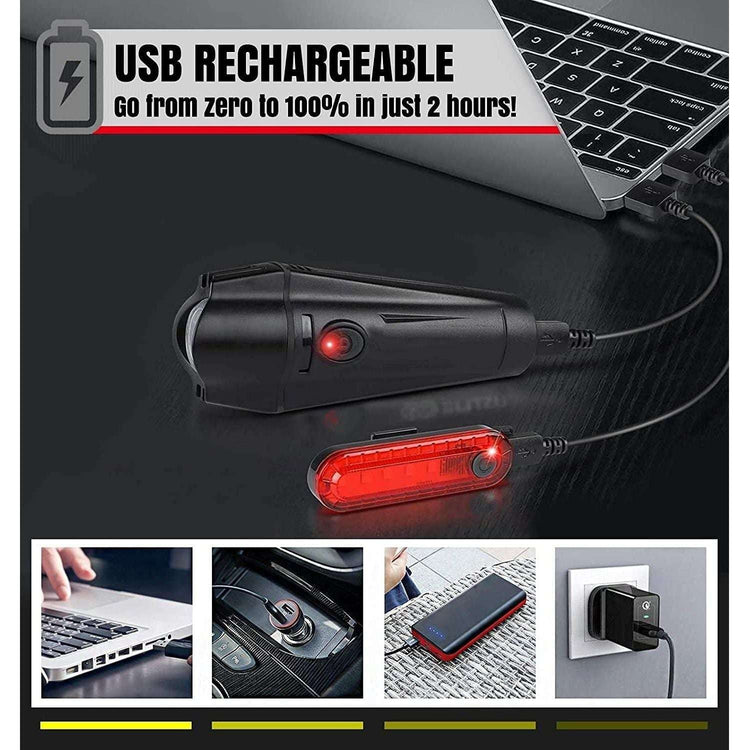 Advanced Design: USB rechargeable front and backlight, built in 1800mAh rechargeable lithium battery for Headlight Waterproof rated to IPX4 - Protected against splashing water from any angle.